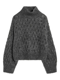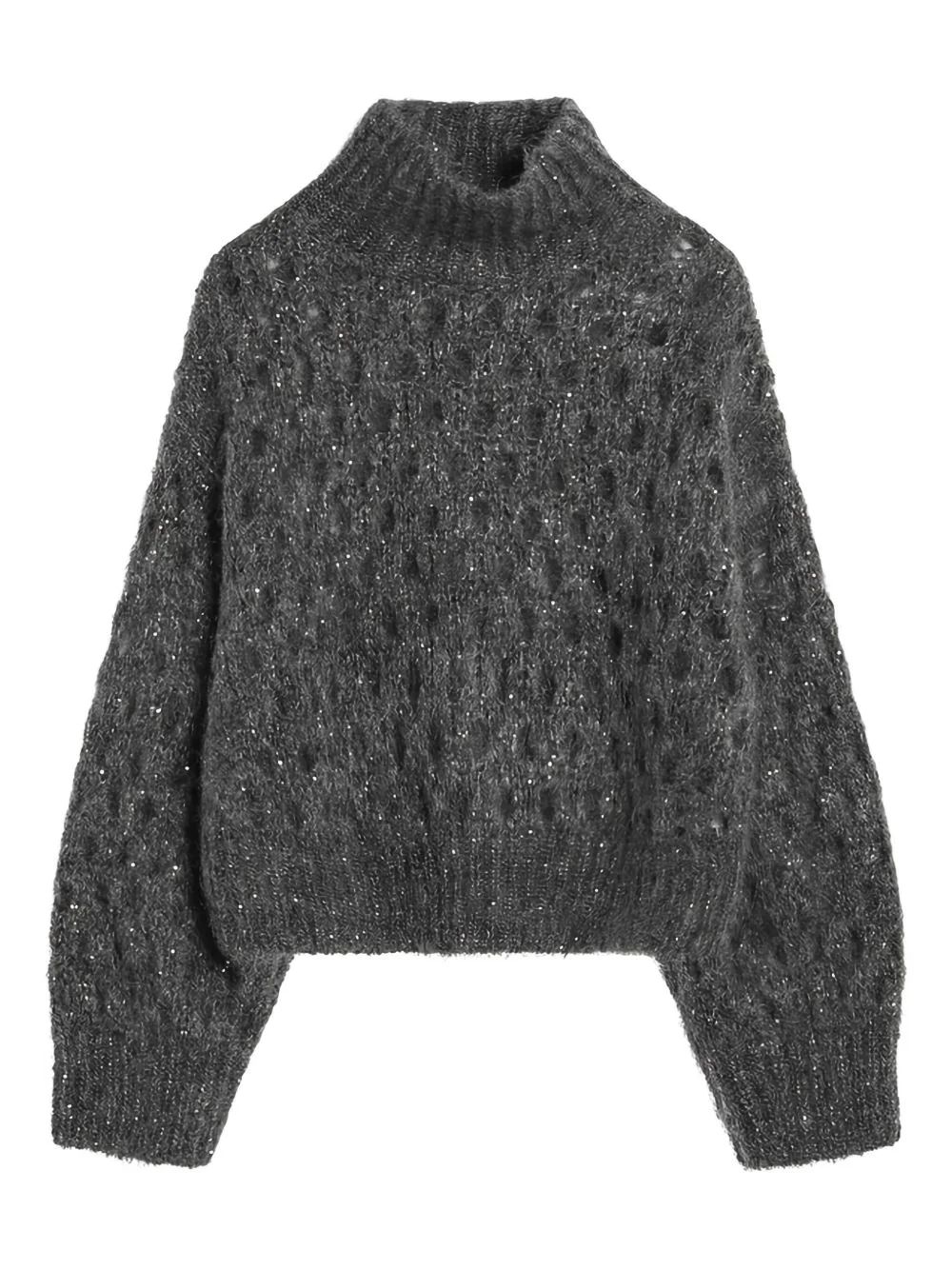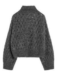 open-knit turtleneck sweater Highlights - Dark grey - Open-knit pattern - Turtleneck - Long sleeve Made in Italy Composition Mohair 54%, Nylon 26%, Polyester 15%, Wool 5% Washing instructions Read Manufacturer Guidelines