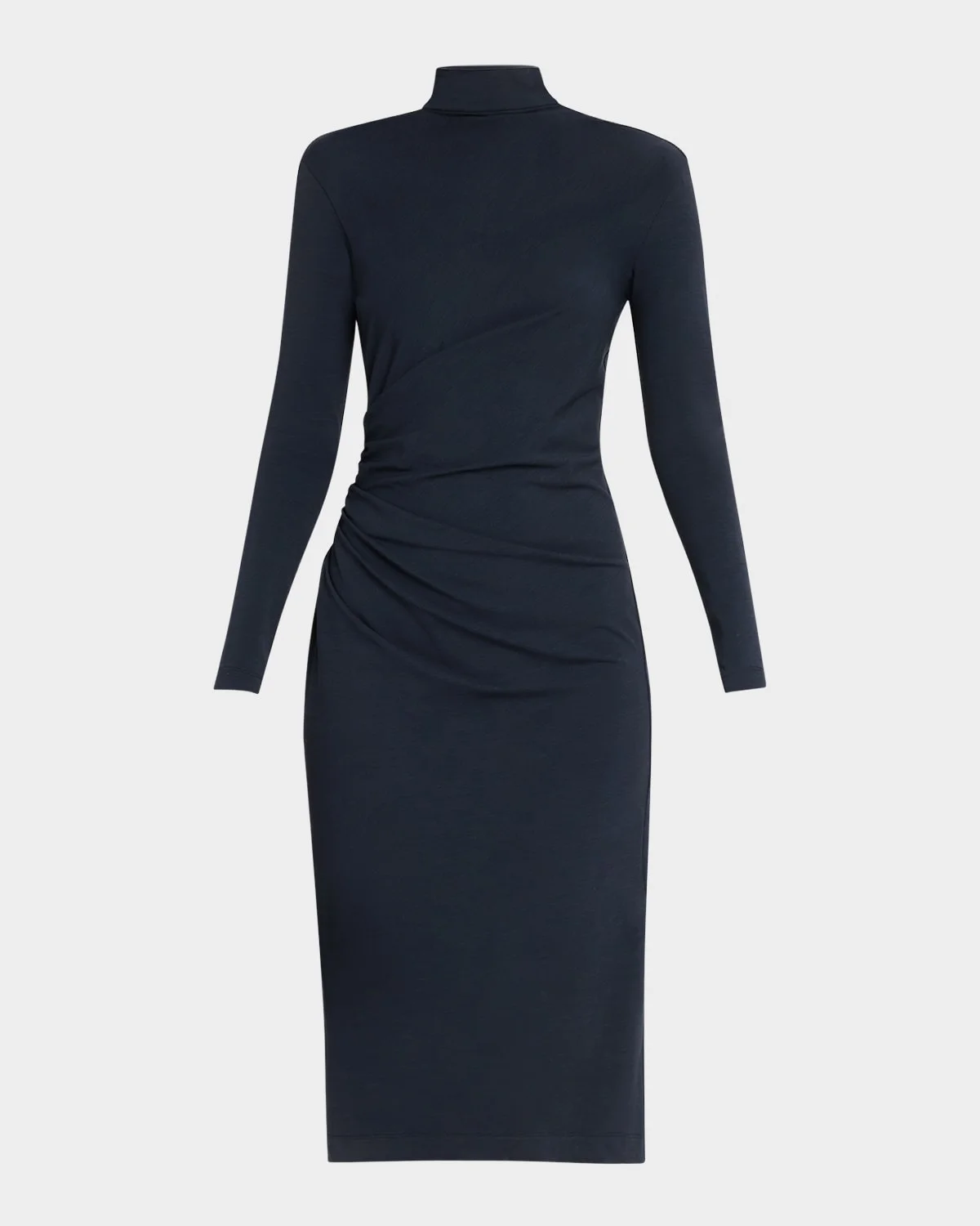 Synched-Waist Wool Jersey Long-Sleeve Midi Dress