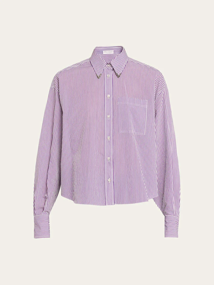 A fresh take on the classic button-down, this Brunello Cucinelli top, crafted from a technical cotton, is elevated with brass trim along the collar. Dropped shoulders Long sleeves with button cuffs Chest pocket Classic fit Hem falls to the hip Button-front Cotton/polyester Dry clean Made in Italy Online Inquiries: BGS21_BA4KX| Store Inquiries: #5034206