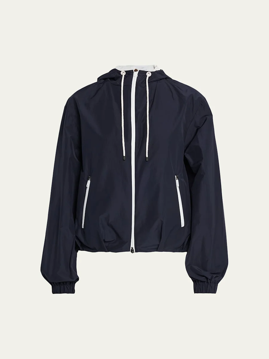Crafted from techno cotton, this track jacket from Brunello Cucinelli features signature monili trim on the drawstring tips Drawstring hooded neckline; twoway zip front Long sleeves Hip zip pockets Relaxed fit Hip length Elasticized cuffs and hem Cotton/polyester/nylon/polyamide Dry clean Made in Italy SIZE amp; FITModel measurements: 5'10" tall Model is wearing a US size 4/Small