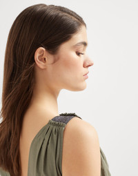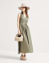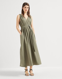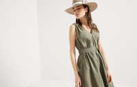 The combination of casual materials, feminine lines and precious details defines the style of this new techno cotton poplin dress. The season’s colors highlight the fabric’s light texture, while the adjustable waist belt enhances the garment’s wide, fluid silhouette. A sparkling monili embroidery illuminates the shoulders with a particularly elegant note. MATERIALS Lightweight techno cotton poplin is a classic fabric of the Brunello Cucinelli collections. The presence of synthetic fiber helps to preserve the texture’s slightly irregular effect. An unlined construction promotes the fabric’s lightweight and fluid traits. DETAILS V-neck Attached ring belt Nickel-free monili decoration 75% COTTON, 25% NYLON