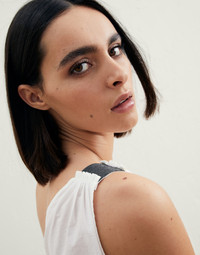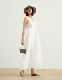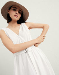 The combination of feminine lines, precious details and fabrics with a casual feel defines the style of this new dress. A typical element of shirting, techno cotton poplin offers a light, crisp texture that enhances the garment’s fluid lines: together with the pleated effect that forms on the surface of the skirt, the waist belt emphasizes the volume that descends softly and wide. The straps with an embroidered insert in rows of shiny monili complete the style of the garment with an elegant, sparkling note in true Brunello Cucinelli style. MATERIALS Lightweight techno cotton poplin is a classic fabric of the Brunello Cucinelli collections. The presence of the synthetic fiber helps to preserve the texture’s slightly irregular effect. DETAILS V-neck Hand pockets Off-the-shoulder style Low back neckline at back Elastic waistband Attached ring belt Side vents at bottom Unlined Nickel-free monili decoration 75% COTTON, 25% NYLON