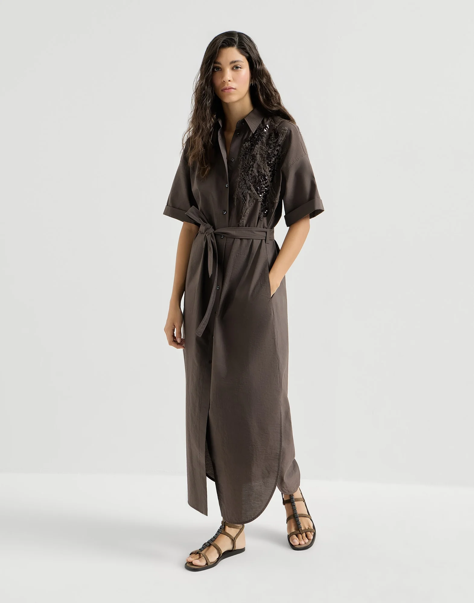 Contemporary volume and the season’s embellishments come together in this techno cotton poplin dress with dazzling seabed embroidery. A precious tonal sequin design recreates the reflections of a seabed, with iridescent surfaces that evoke the luster of shells. The feminine silhouette combines classic shirting elements with volume that falls straight, gathered by a waist belt. MATERIALS Lightweight techno cotton poplin is a classic fabric of the Brunello Cucinelli collections. The presence of the synthetic fiber helps to preserve the texture’s slightly irregular effect. A silk-blend crepe lining provides added comfort. DETAILS Shirt-style collar Button closure Wide sleeve Detachable tie belt Hand pockets 75% COTTON, 25% NYLON