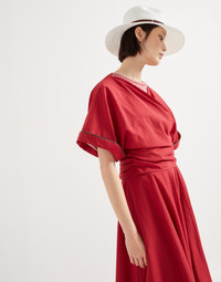 This new kimono-style top reinterprets traditional Japanese elegance in a contemporary way. Versatile and comfortable, the garment features generous, softly draping sleeves, highlighted by a fine precious monili embroidery for a feminine sparkling touch in true Brunello Cucinelli style. The d-ring belt closure gathers the volume that wraps at the waist. MATERIALS Lightweight techno cotton poplin is a classic fabric of the Brunello Cucinelli collections. The presence of the synthetic fiber helps to preserve the texture’s slightly irregular effect. DETAILS Attached ring belt Nickel-free monili decoration 75% COTTON, 25% NYLON