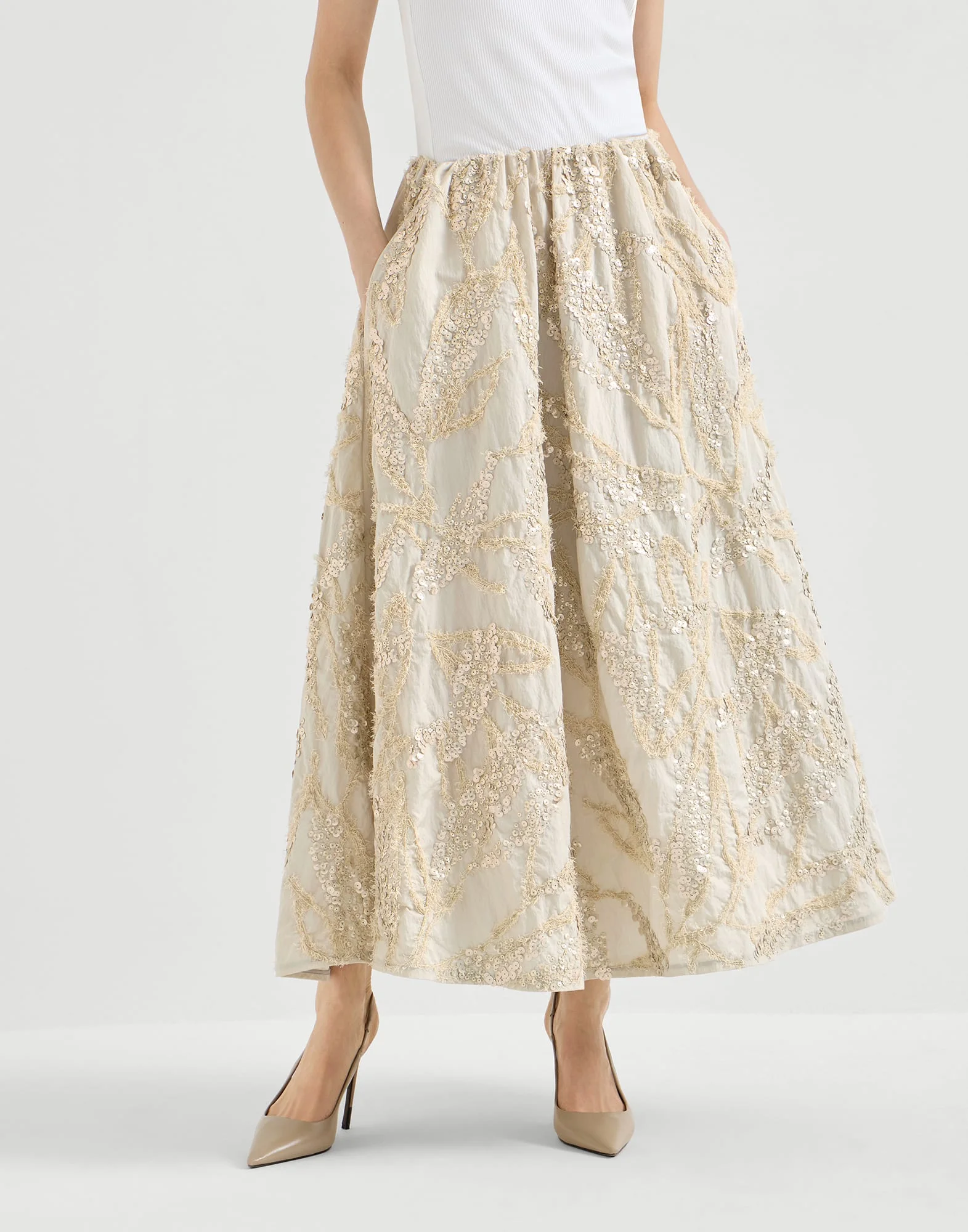 Essential volume and the season’s embellishments come together in this techno cotton poplin skirt with dazzling seabed embroidery. A precious tonal sequin design covers the garment, recreating the reflections of a seabed, with iridescent surfaces that evoke the luster of shells. The pull-on fit enhances the comfort. MATERIALS Lightweight techno cotton poplin is a classic fabric of the Brunello Cucinelli collections. The presence of the synthetic fiber helps to preserve the texture’s slightly irregular effect. A silk-blend crepe lining provides added comfort. DETAILS Pull-up skirt Elastic waistband 75% COTTON, 25% NYLON