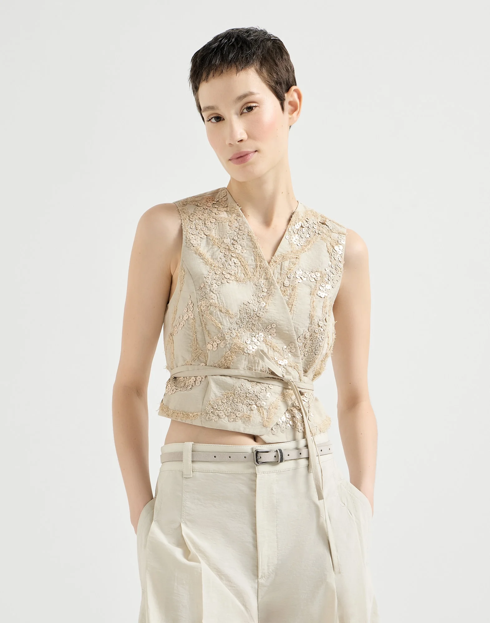 Essential lines and the season’s embellishments come together in this techno cotton poplin vest with dazzling seabed embroidery. A precious tonal sequin design covers the garment, recreating the reflections of a seabed, with iridescent surfaces that evoke the luster of shells. The silhouette is completed with a thin belt that gathers the volume in the waist. MATERIALS Lightweight techno cotton poplin is a classic fabric of the Brunello Cucinelli collections. The presence of the synthetic fiber helps to preserve the texture’s slightly irregular effect. A silk-blend crepe lining provides added comfort. DETAILS Strap closure Silk-blend crepe lining Special workmanship 75% COTTON, 25% NYLON