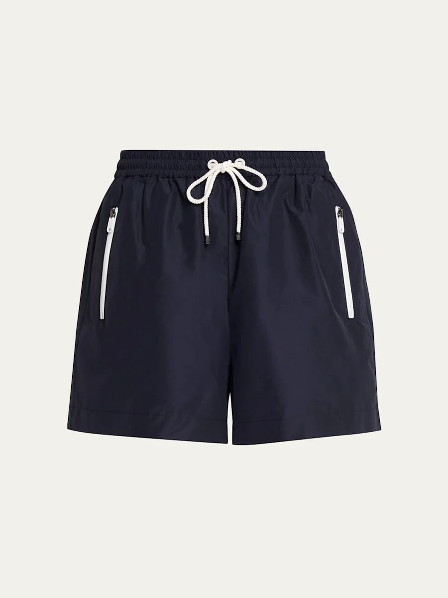 Crafted from techno cottonblend, these shorts from Brunello Cucinelli feature an elasticized drawstring waistband with monili tips and contrast zipper pockets Mid rise sits high on hip Front zipper pockets Easy legs Pullon style Cotton/polyester/nylon/polyamide Dry clean Made in Italy SIZE amp; FITModel measurements: 5'10" tall Model is wearing a US size 4/Small