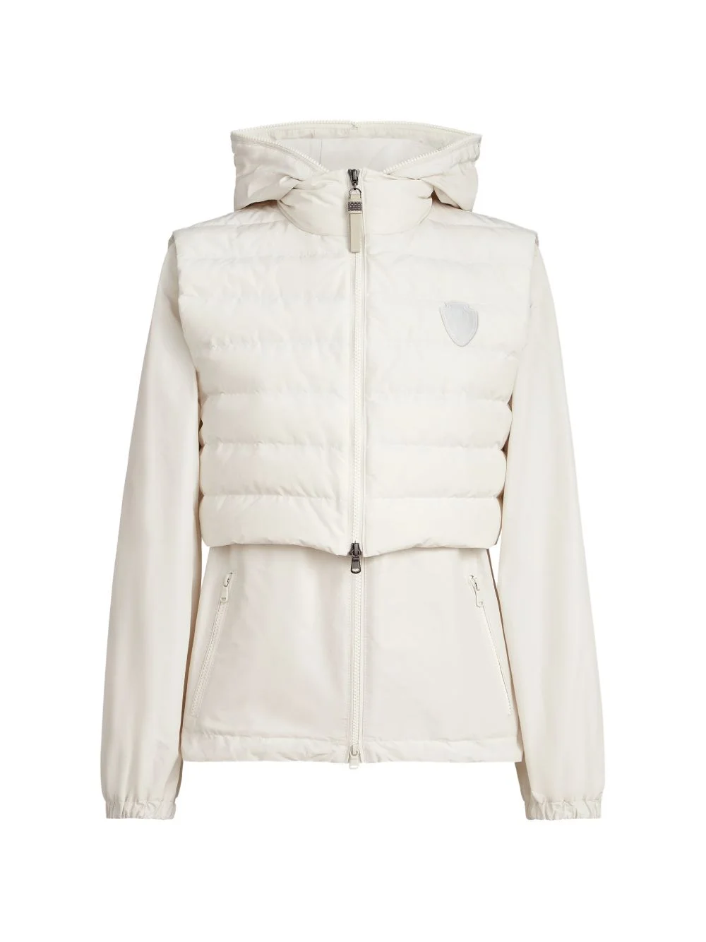 techno cotton taffeta outerwear jacket with detachable down vest, logo and monili Highlights - Two-way zip closure - Stand-up collar - Adjustable drawstring hood - Elastic cuffs - Hand pockets with zipper - Water-resistant nylon lining - Removable outer vest - Drawstring hem - Nickel-free monili decoration Made in Italy Composition Cotton 54%, Polyester 46% Washing instructions Specialist Cleaning