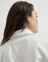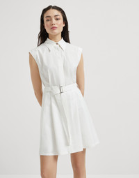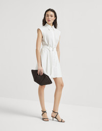 A casual feel and a distinctly feminine attitude define the style of the new techno cotton Texture twill Mini chemisier dress. The sleeveless design features classic shirting elements, while the practical belt gathers volumes, marking the waist. The full button closure runs along the garment to the bottom of the slightly flared skirt. A monili detail behind the neck complements this piece with a sparkling touch, in true Brunello Cucinelli style. MATERIALS The techno cotton twill features a diagonal structure characterized by the typical slightly raised appearance. Made of refined mako cotton, the fabric contains a reduced percentage of ultra-lightweight nylon, which creates a crisp, textured effect. DETAILS Plain fastening with buttons Classic collar Detachable ring belt Unlined Nickel-free monili decoration 86% COTTON, 14% NYLON