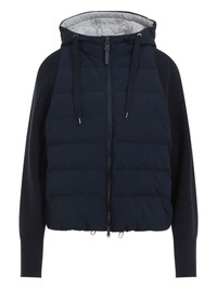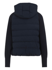padded hooded jacket Highlights - Navy blue - Front zip fastening - Drawstring hood - Quilted panel - Textured sleeves - Side welt pockets Made in Italy Composition Polyamide 74%, Cotton 26% Washing instructions Read Manufacturer Guidelines