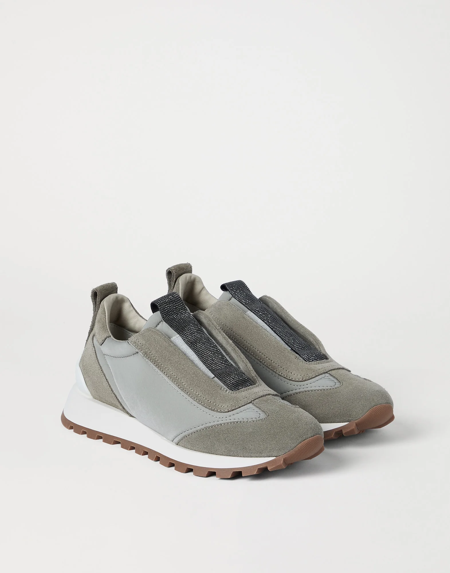 An iconic active style of the Brunello Cucinelli collections, these techno fabric runners combine a casual feel and refined embroideries. Lightweight and comfortable, the footwear perfectly pairs the sporty attitude of the technical fabric with the sophistication of elegant suede inserts. The tongue is embellished with a shiny monili embroidery, creating an elevated contrast with a shimmering, feminine appearance. MATERIALS The techno fabric features a smooth, lightweight texture that alternates with the soft, velvety surface of the refined suede. The lightweight rubber outsole and tread provide the fit with added comfort. DETAILS Fabric lining Sole in lightweight micro rubber TPU rubber tread Nickel-free monili decoration 70% POLYESTER, 30% NYLON