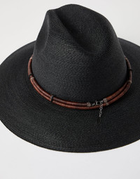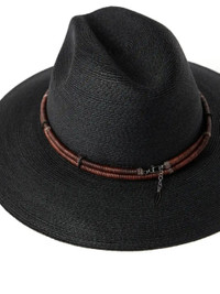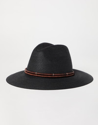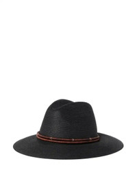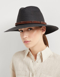 The combination of refined materials enriches the style of this elegant fedora. The hemp and techno cotton base is enhanced by a leather band, giving the accessory an exotic touch. The shiny monili details add a precious, feminine note. MATERIALS The base is crafted of woven hemp, cotton and nylon straw with a special lightweight, thin and slightly irregular appearance. DETAILS Unlined All metal parts are Nickel-free 76% HEMP, 18% COTTON, 6% NYLON