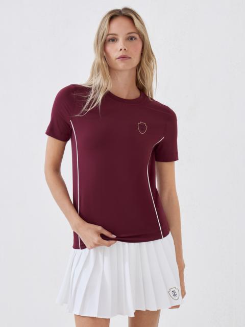 A sporty attitude and iconic elements define the style of this techno jersey T-shirt. The close-fitting design features a classic crewneck and short sleeves. The precious Solomeo heraldic coat of arms on the chest complements the T-shirt. MATERIALS The synthetic fiber composition of techno jersey helps to make the texture comfortable to wear and quick to dry. DETAILS Crew-neck 90% POLYESTER, 10% ELASTANE