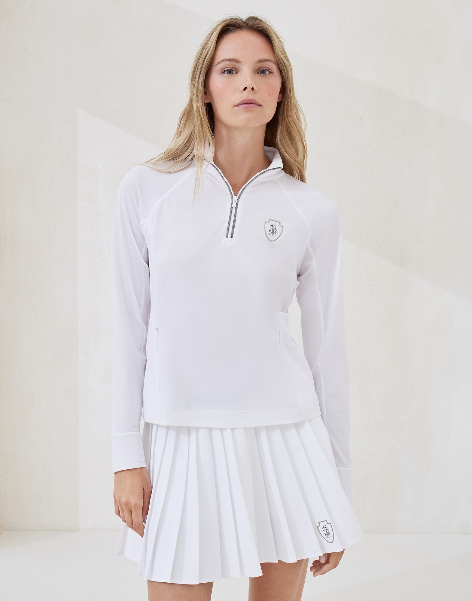 The informal feel of this techno pique mock-neck sweatshirt is enriched with iconic embellishments. The technical fabric enhances the garment's close-fitting design and comfort, while a bright monili embroidery runs along the zipper closure and adds a radiant sparkling note, in pure Brunello Cucinelli style. The Solomeo heraldic coat of arms on the chest complements the look of the garment. MATERIALS Research on the finest materials elevates the sporty feel of pique, comprising a reduced percentage of synthetic fiber for maximum comfort. DETAILS Zip opening Hand pockets with zipper Nickel-free monili decoration 50% NYLON, 45% POLYESTER, 5% ELASTANE