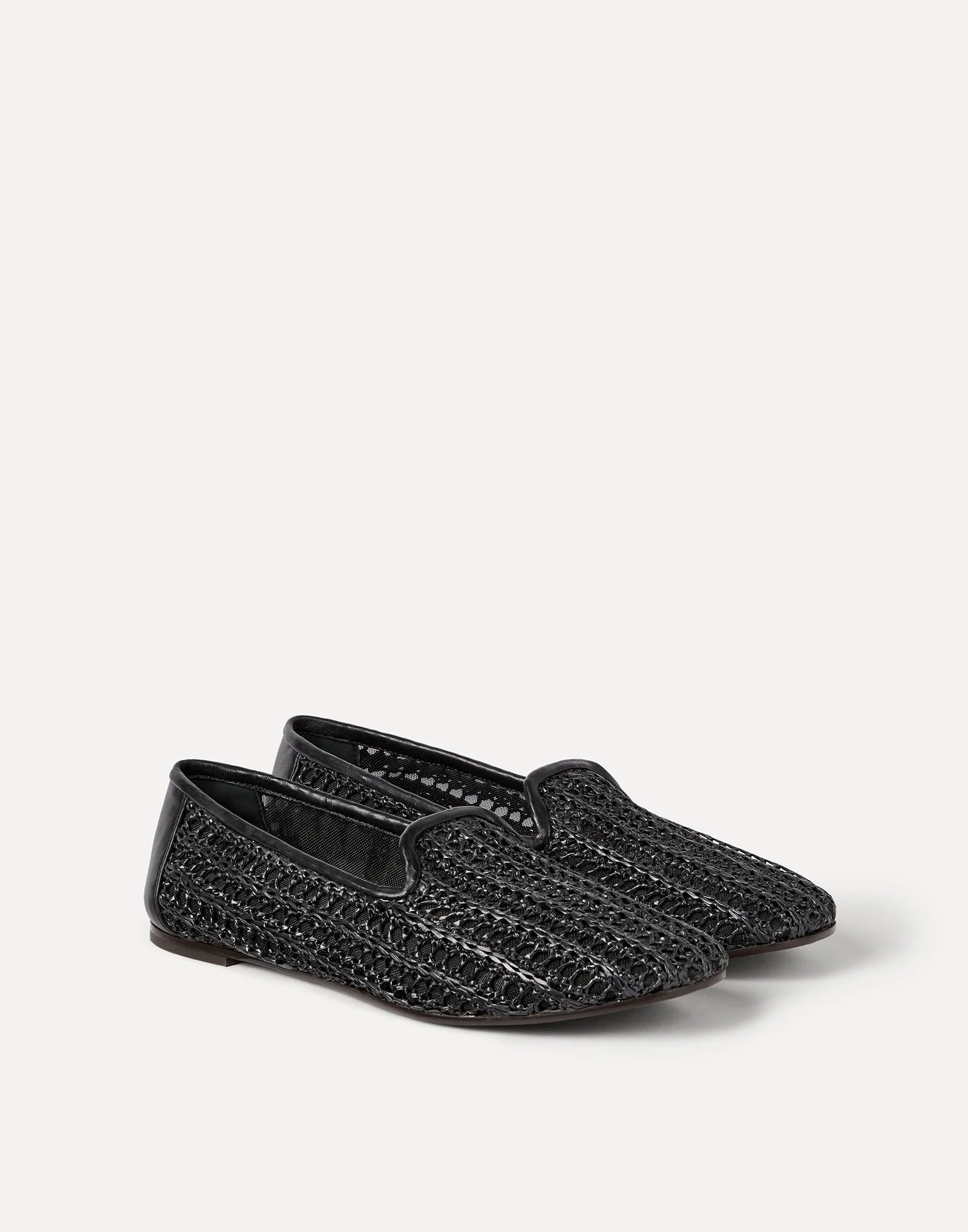Summer style and sophisticated workmanship come together in these techno raffia flats. The minimal, tapered design stands out for its entirely woven techno raffia upper, while the tonal leather trim details adds a delicate material contrast. MATERIALS The material is characterized by a slightly “rustic” woven texture inspired by the typical look of raffia. DETAILS Leather outsole with rubber heel and non-slip island at the toe 100% NYLON
