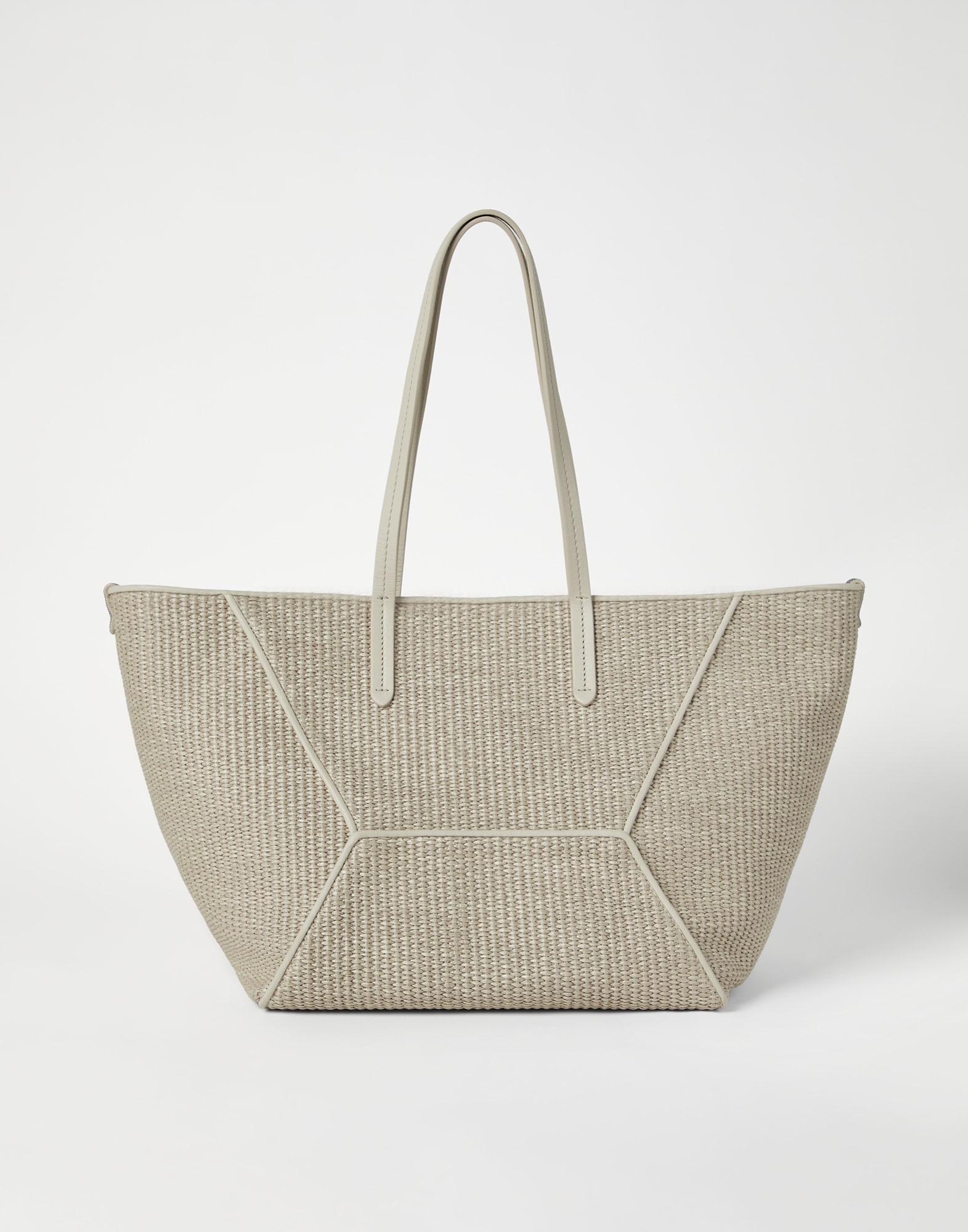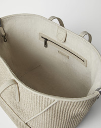 The summery allure of techno raffia updates the essential silhouette of this Shopper bag, an ideal accessory for everyday occasions. The woven texture gives the bag a light, natural feel, while the handles and trim are detailed in soft leather for a sophisticated material contrast. The feminine touch of the embroidered shiny monili inserts illuminates the sides of accessory with the iconic embellishment of the Brunello Cucinelli collections. If fastened, the internal ties on the sides allow the shape of the bag to change, making it more compact. MATERIALS The material is characterized by a slightly “rustic” woven texture inspired by the typical appearance of raffia. DETAILS Magnetic snap closure Double handle Cotton lining Internal pocket with zip closure Nickel-free monili decoration Bag is 53 cm long, 22 cm wide and 29 cm high 55% COTTON, 45% NYLON
