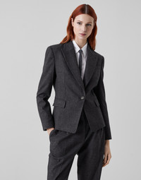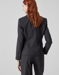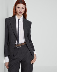 The refined flair of techno virgin wool retro flannel meets feminine lines in this blazer. The slightly waisted cropped silhouette is close-fitting to the body on the shoulders and along the hips and pairs perfectly with the classic inspiration of the fabric. A precious monili embroidery behind the neck complements this blazer with a subtle sparkling note in true Brunello Cucinelli style. MATERIALS A classic fabric of formal menswear, virgin wool flannel is presented in a sophisticated retro-inspired version with a streaked-colored texture. Twisting of the thread creates lightness, fluidity and a soft hand, while a small percentage of spandex provides added comfort. DETAILS Horn button closure Silk-blend crêpe lining Lapel collar Hand pockets with flap Chest pocket Cuffs have four horn buttons Nickel-free monili decoration 60% VIRGIN WOOL, 18% VISCOSE, 18% POLYESTER, 2% NYLON, 2% ELASTANE
