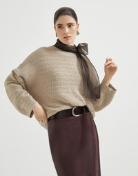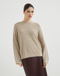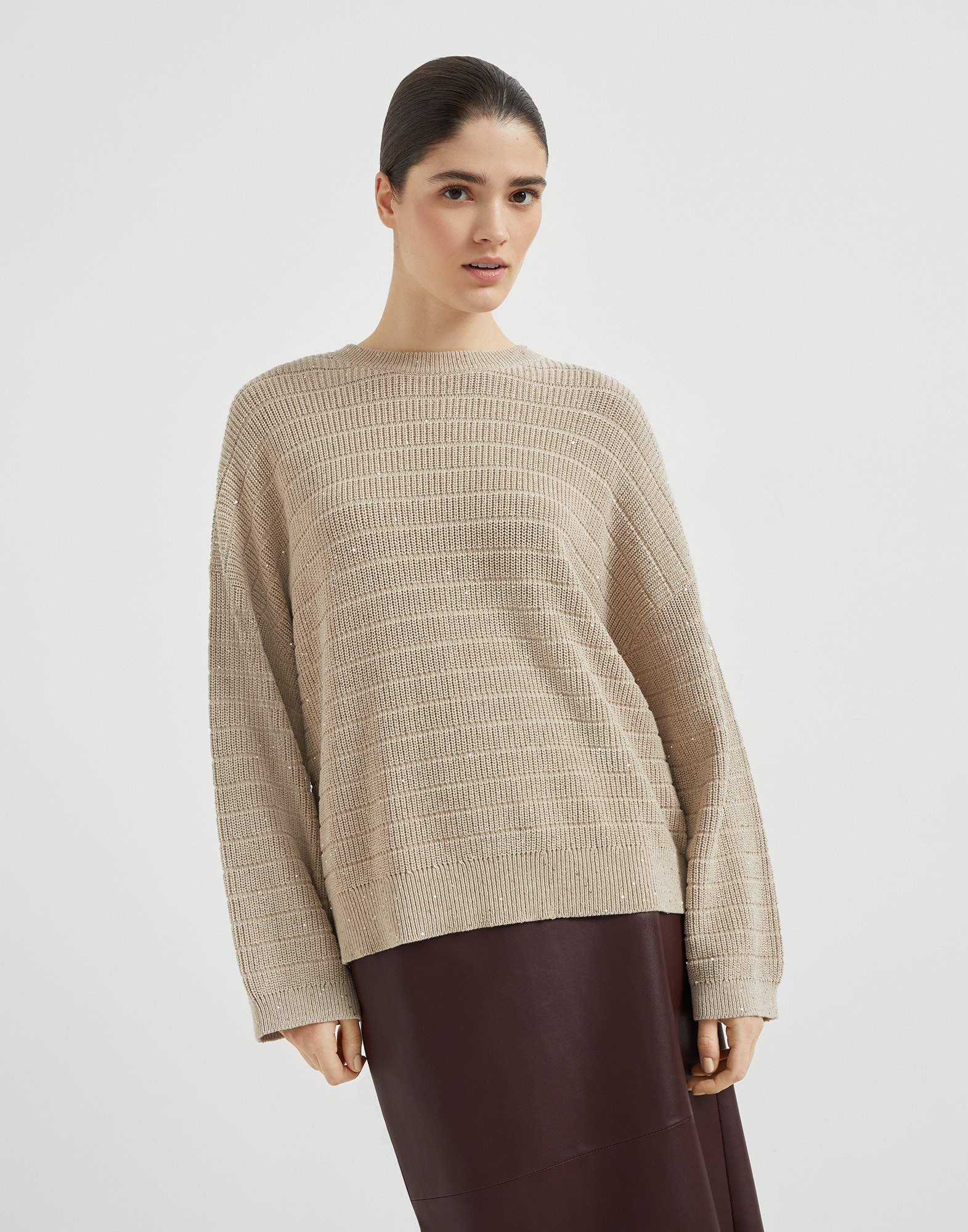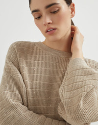 The preciousness of cotton Diamond yarn adds a refined touch to this new textured half English rib sweater, elevating the informal style with shiny details. The relaxed silhouette, featuring dropped shoulders and wide sleeves, is enriched with the delicate shimmering reflections of the tonal sequins embedded into the yarn for a sophisticated, feminine effect. The half English rib knitting adds depth and softness, enhancing the garment’s cozy, structured character. MATERIALS The manufacturing of lightweight Diamond yarn combines the fresh, natural touch of pure cotton with small paillettes incorporated into the yarn, spreading delicate sparkling reflections on the surface of the piece. DETAILS Crew-neck Drop shoulder Wide sleeve Half English rib 96% COTTON, 4% POLYESTER
