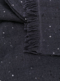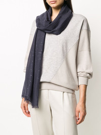 textured scarf Navy blue silk and cashmere textured scarf from Brunello Cucinelli featuring frayed edges. Made in Italy Composition Silk 30% SIZE & FIT Model measurements Height 5 ft 11 in(1.8 m) Bust/Chest 33.07 in(84 cm) Hips 37.4 in(95 cm) Waist 25.19 in(64 cm) Measurement LENGTH 78.74 in(200 cm) WIDTH 29.13 in(74 cm) Washing instructions Dry Clean Only