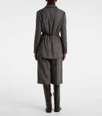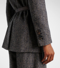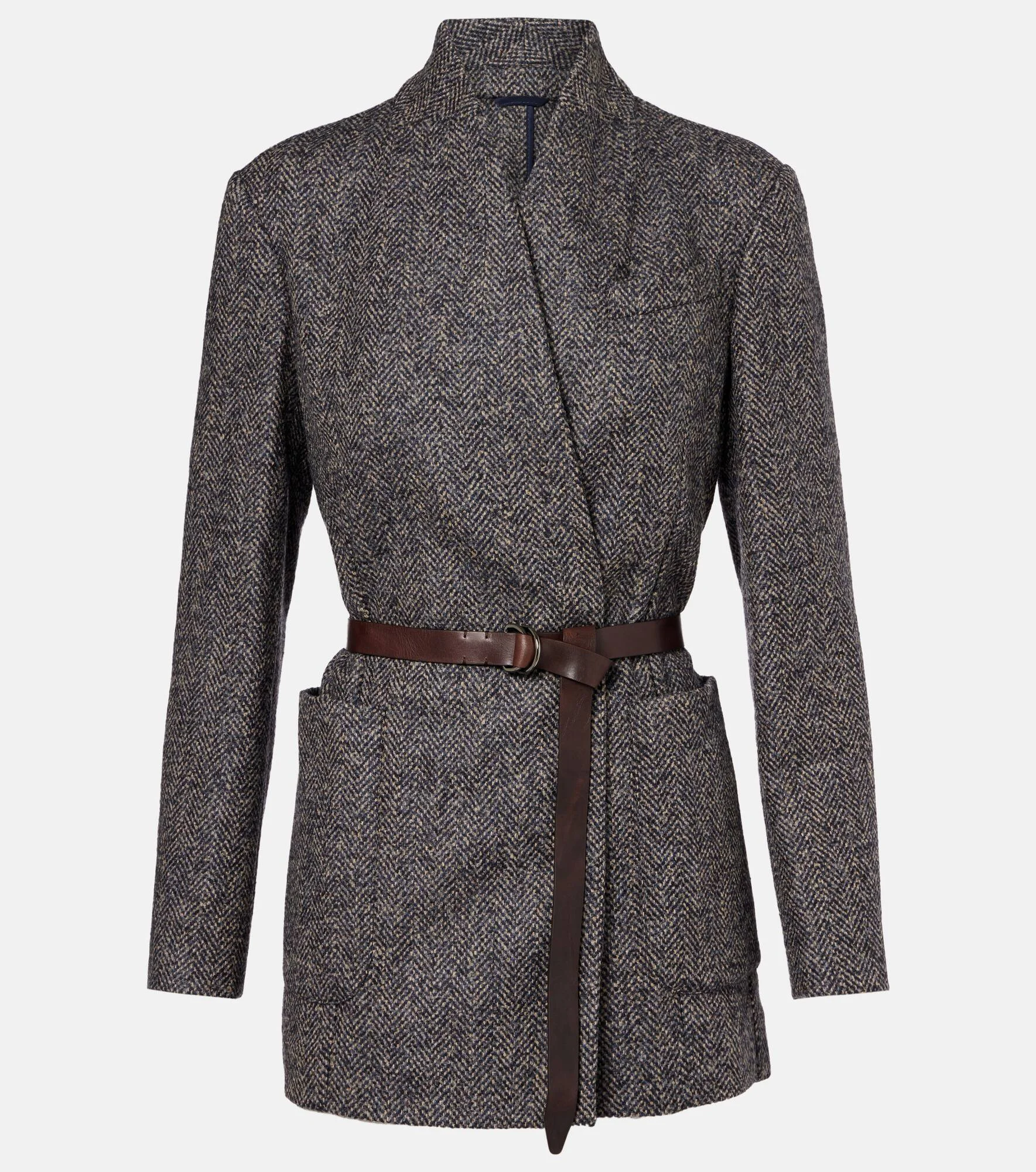 Crafted from a wool-blend herringbone tweed, this blazer reinterprets classic tailoring with Brunello Cucinelli's signature touch. Patch pockets, an equestrian-inspired leather belt, and delicate Monili beading enhance the timeless elegance of this design. Product Details - Material: 73% wool, 27% polyamide - Care instructions: dry clean - Made in Italy - Designer color name: Ocra/Blu - Item color: beige, blue - Pocket lining: 74% acetate, 26% silk - Sleeve lining: 65% acetate, 35% polyester - Material II: 100% leather - Details: 100% brass - Contains non-textile parts of animal origin - Closure: concealed buttoned front - Pockets: ticket pocket, patch pockets, internal pocket - Cuff: four buttons - Belt loops - Detachable belt - Vent: single - Unlined - Item number: P01083497 Size & Fit - True to size - Loose fit, comes with belt - Non-stretchy fabric - Falls below the hip - The model seen in the picture is 178cm-5'10" and wearing a size IT 40