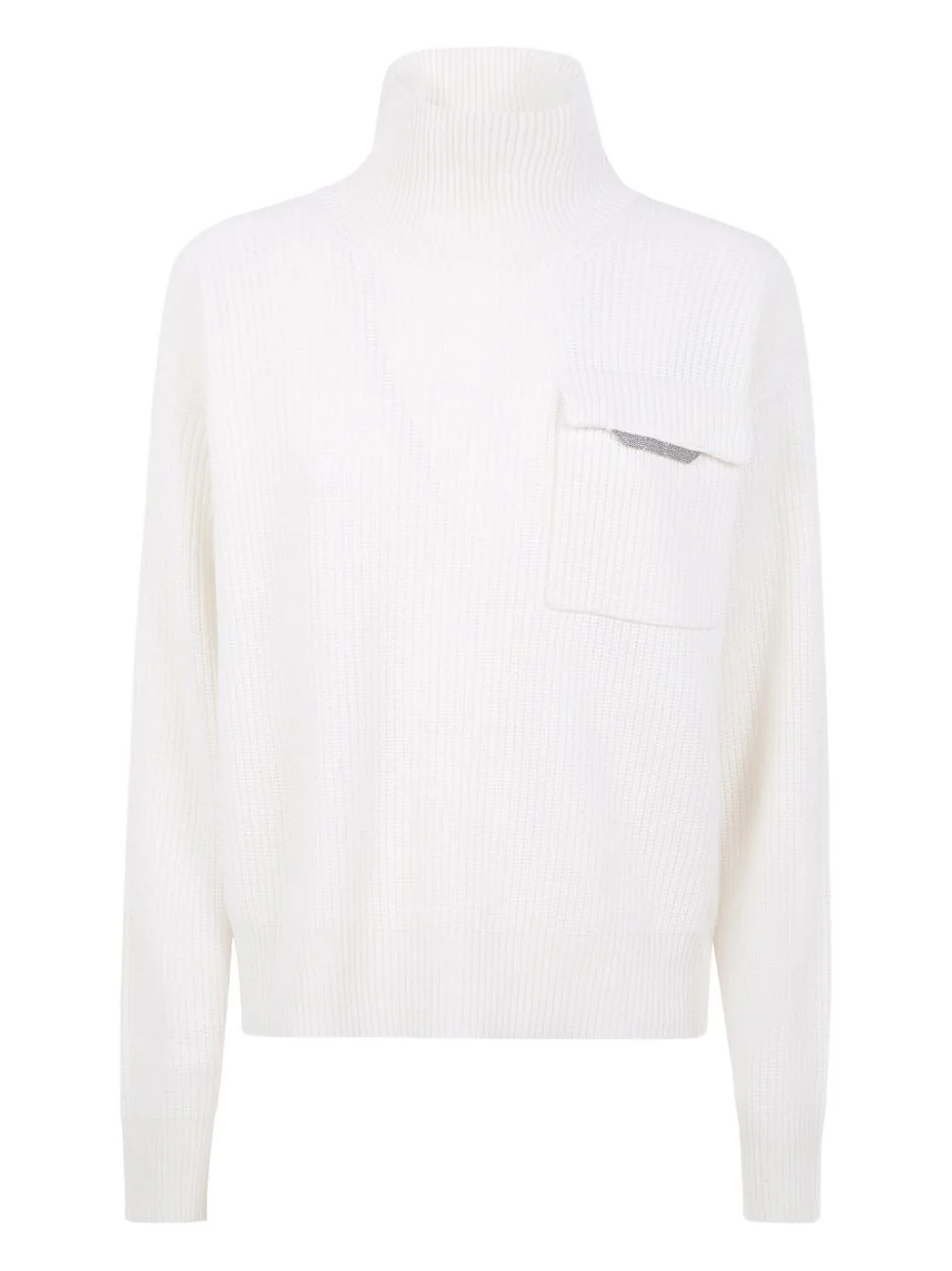 high-neck pocket sweatshirt Highlights - Off-white - Ribbed knit - High neck - Patch pocket - Metallic embellishment - Long sleeves Imported Composition Cashmere 100% Washing instructions Read Manufacturer Guidelines
