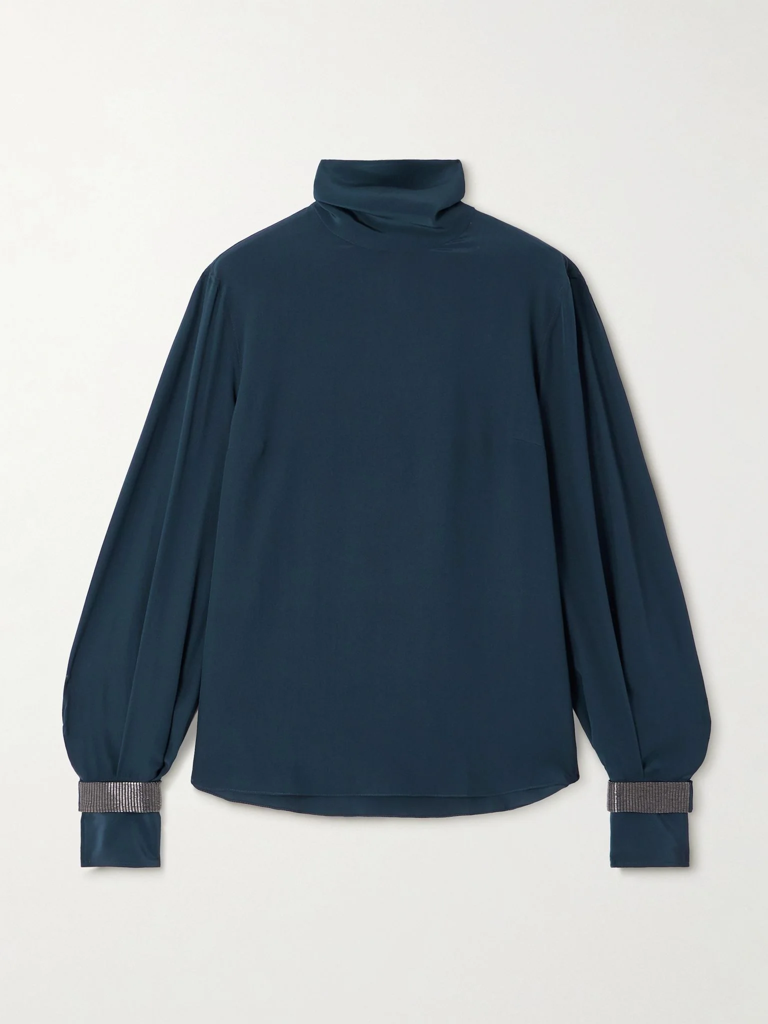 Bead-embellished silk crepe de chine turtleneck blouse Navy