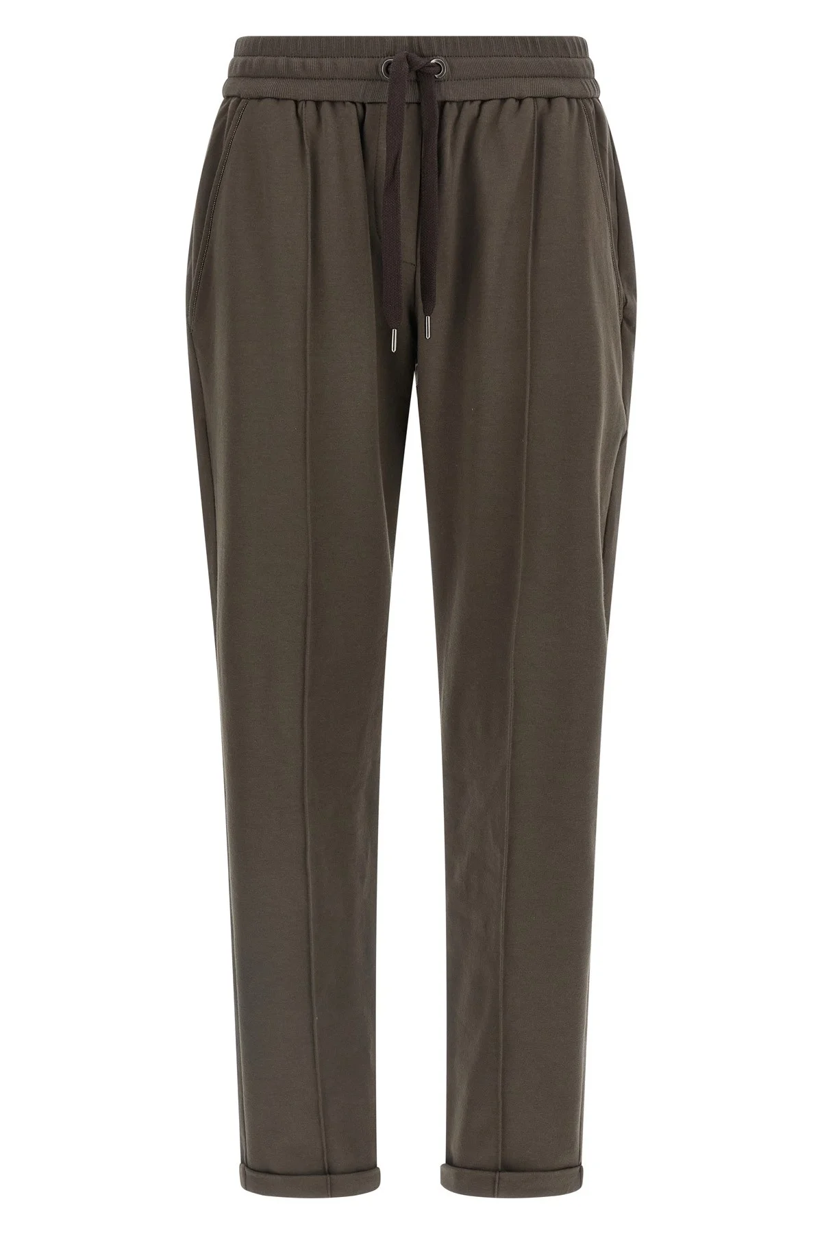 cod. MH827FB799C8589 'Track' joggers in light stretch cotton sweatshirt, pockets with Monile detail and front stitching, pull-up fit, slightly crop style, trompe l'oeil flap, elastic with adjustable drawstring at the waist, turn-up on the leg bottom. Color: Brown Size & Fit: true to size fit Composition: 98% cotton, 2% elastane Made in: Italy