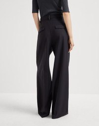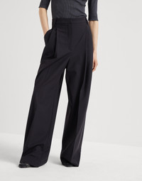 The fluid, lightweight texture of Tropical Luxury wool enhances the feminine lines of these Wide trousers. As a modern take on tailored silhouettes, high-rise proportions flow comfortably with long pleats and loose, straight lines along the leg. A shiny monili embroidery illuminates the back loop and complements the piece with an unexpected sparkling note. MATERIALS The lightweight fabric combines the virgin wool natural fiber with a percentage of synthetic to provide added comfort. DETAILS Zip closure with metal hook and backing button Front pockets Back pockets with flap Double pleat Nickel-free monili decoration 75% VIRGIN WOOL, 23% NYLON, 2% ELASTANE