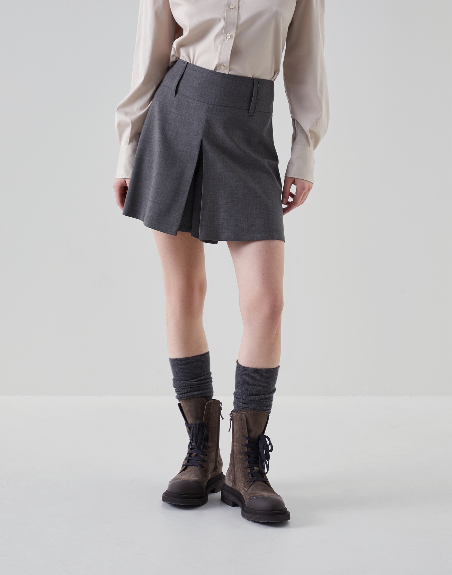 Feminine details update the iconic silhouette of this mini Skirtpant, inspired by the aesthetic of school uniforms from the 1990s. The lightweight texture of Topical Luxury wool enhances the volumes, which flow down along the hips, with a relaxed and slightly flared design. The mini length highlights the garment’s effortless feel, while a shiny monili embroidery on the front loop adds a sparkling touch in pure Brunello Cucinelli style. MATERIALS The lightweight fabric combines the virgin wool natural fiber with a percentage of synthetic to provide added comfort. DETAILS Zip closure Nickel-free monili decoration 75% VIRGIN WOOL, 23% NYLON, 2% ELASTANE