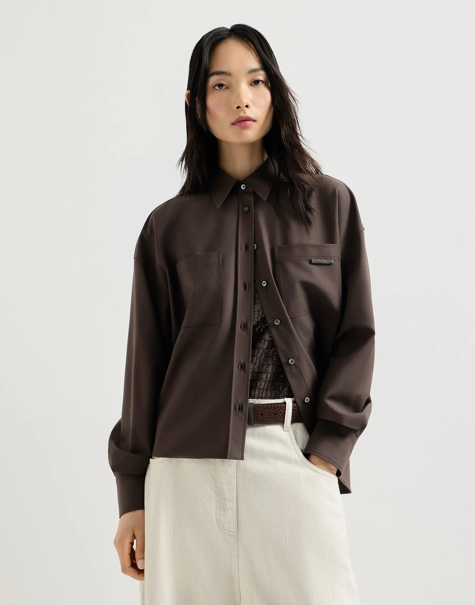 Refined Tropical Luxury wool enriches this new shirt with an impeccable, sophisticated appearance. Inspired by classic masculine elegance, the style showcases essential lines delivered in a feminine way thanks to the cropped cut and the slightly full sleeves. The shiny monili embroidery on the chest pocket completes the garment with the iconic touch of the Brunello Cucinelli collections. MATERIALS The lightweight fabric combines the virgin wool natural fiber with a percentage of synthetic to provide added comfort. DETAILS Button fastening with placket Classic collar Two patch chest pockets Cuffs have one mother of pearl button Nickel-free monili decoration 75% VIRGIN WOOL, 23% NYLON, 2% ELASTANE