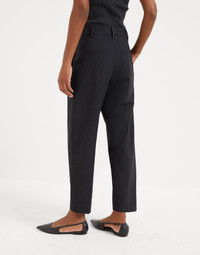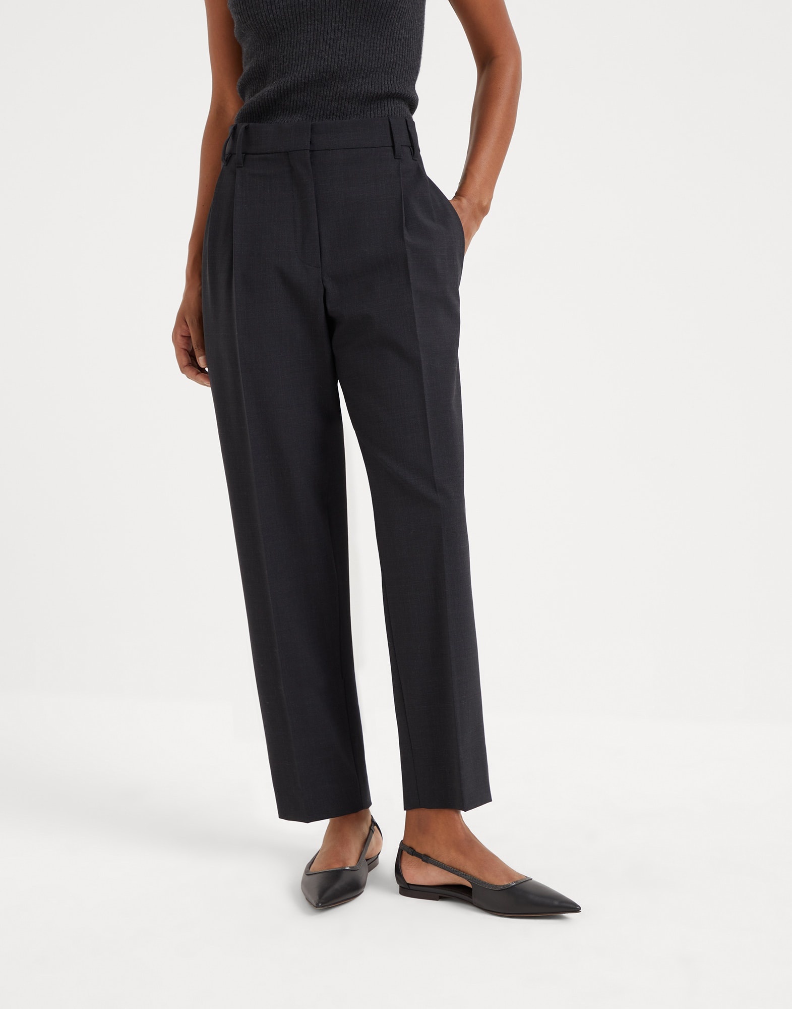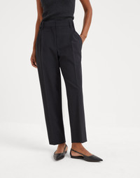 The relaxed lines of the Slouchy silhouette are paired with tailored details in these Tropical Luxury wool trousers. The fabric’s light texture meets the classic details of the double pleats and the rear welt pockets, while a shiny monili embroidery illuminates the rear belt loop, adding a feminine touch to the garment. MATERIALS The lightweight fabric combines the virgin wool natural fiber with a percentage of synthetic to provide added comfort. DETAILS Zip closure with metal hook and backing button Front pockets Back welt pockets Double pleat Nickel-free monili decoration 75% VIRGIN WOOL, 23% NYLON, 2% ELASTANE