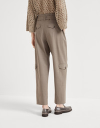 Refined Tropical Luxury wool enhances the casual, metropolitan attitude of these new Utility trousers. The d-ring belt gathers the volume in the waist, creating a slight cinched effect that is paired with the large buttoned patch pockets, typical of sportswear-inspired designs. The silhouette features soft proportions in the seat and leg, tapering slightly at the bottom. MATERIALS The lightweight fabric combines the virgin wool natural fiber with a percentage of synthetic to provide added comfort. DETAILS Zip closure with button Detachable ring belt Vertical front pockets Cargo pockets with flap and button Back welt pocket with flap and button Unlined 75% VIRGIN WOOL, 23% NYLON, 2% ELASTANE