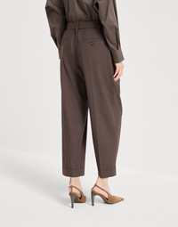 A sporty attitude and tailored details come together in these new Sartorial Baggy trousers. The double pleats and the pressed crease on the front elevate the relaxed silhouette, characterized by soft volume that develops straight down the leg. The d-ring belt and the cuff at the bottom highlight the garment’s informal feel. MATERIALS The lightweight fabric combines the virgin wool natural fiber with a percentage of synthetic to provide added comfort. DETAILS Zip closure with metal hooks and backing button Detachable ring belt Slanted front pockets Double pleat Back welt pockets with button Rear elastic band Unlined 75% VIRGIN WOOL, 23% NYLON, 2% ELASTANE