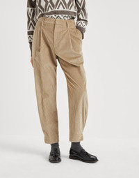 The contemporary style of these new Baggy Sartorial trousers is enriched with elegant tailored details. The front pleats give the garment a flawless, clean silhouette, while the slightly loose fit creates a relaxed look. The ribbing enhances the cotton corduroy with its three-dimensional texture, giving the garment a timeless appeal. The shiny monili embroidery adds an elegant sparkle with a feminine feel. MATERIALS Pure cotton corduroy is characterized by a soft and velvety texture. The use of the natural fiber gives the garment a balanced weight. DETAILS Zip closure with metal hook and backing button Front pockets Pleat Back pockets Unlined Nickel-free monili decoration 100% COTTON