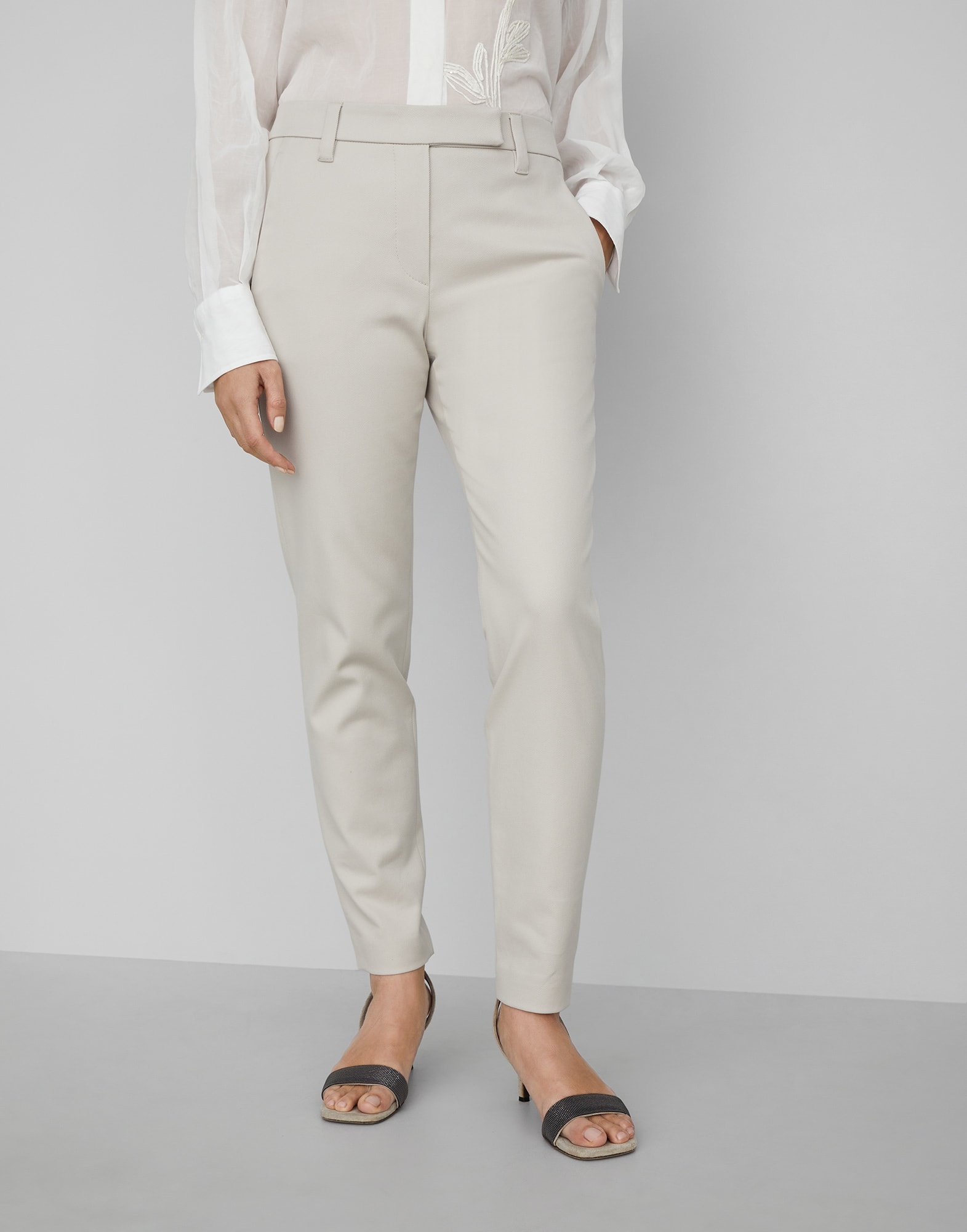 The excellence of Brunello Cucinelli materials elevates the essential, versatile style of these slim fit trousers. The cotton cover enriches the season’s colors with its characteristic diagonal twill and slightly raised texture, while the fabric’s stretch effect pairs perfectly with the slim fit, showcasing lines close to the leg. MATERIALS Cover is a twill fabric characterized by a slightly pronounced diagonal texture. The sporty feel of the fabric is balanced by the yarn dyeing, which disperses the colors of the season with an intense and sophisticated look. A very small percentage of spandex provides added comfort. DETAILS Zip closure with metal hook and backing button Front pockets Back welt pockets 97% COTTON, 3% ELASTANE