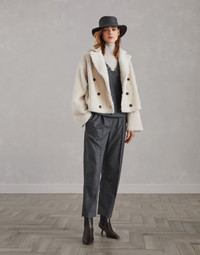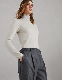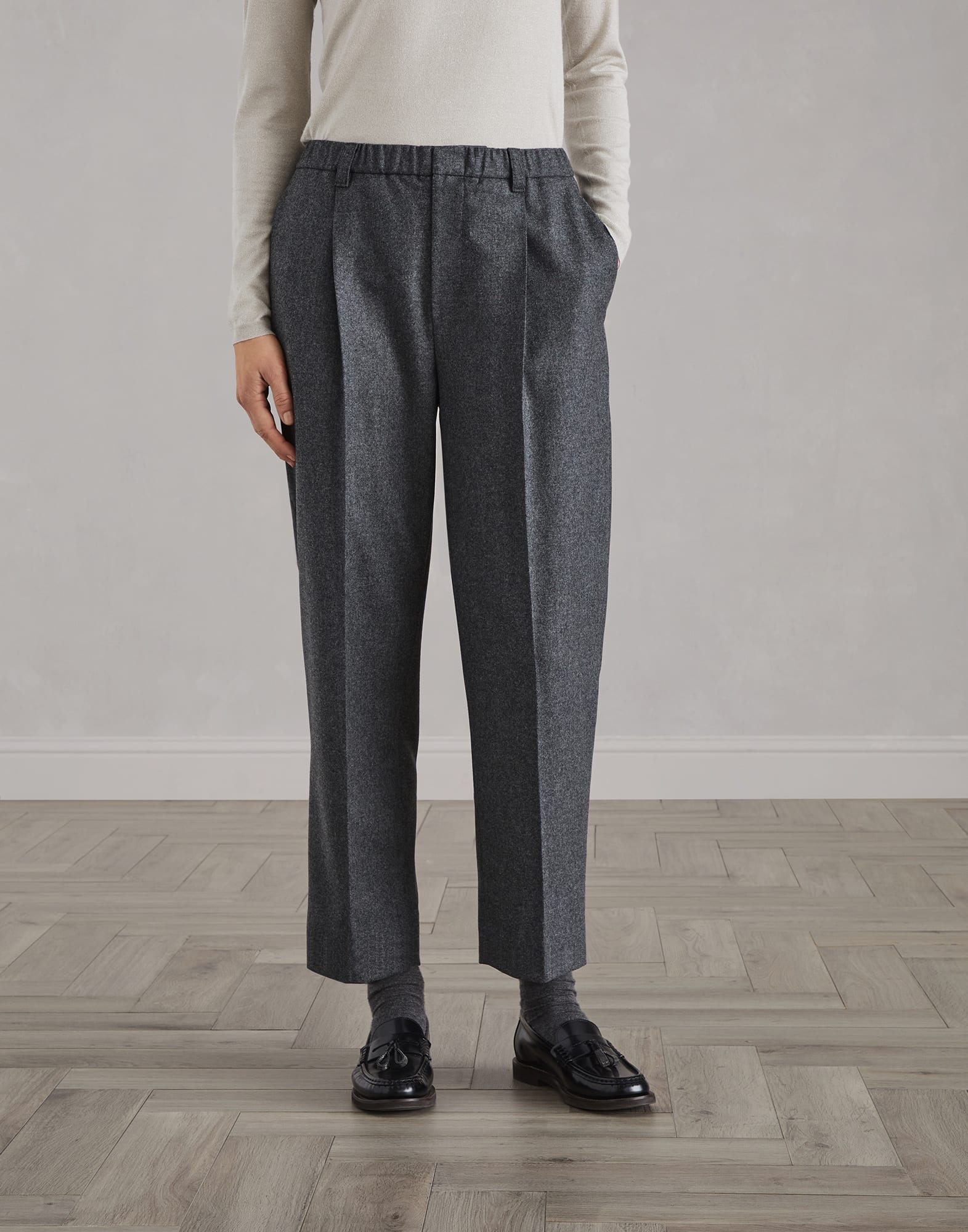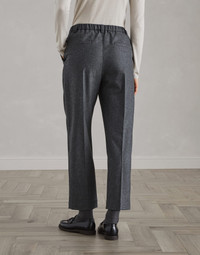 The excellence of Brunello Cucinelli materials is paired with the informal, urban proportions of these new Baggy trousers. The tailored pleats run lightly down the entire length of the leg and emphasize the relaxed, slightly cropped silhouette. The pull-on fit completes the comfortable, casual look of the trousers. MATERIALS The manufacturing of virgin wool and cashmere flannel enhances the noble qualities of the natural fibers, giving the garment a soft appearance. The melange effect makes the texture slightly mottled. DETAILS Zip closure with metal hook and backing button Front pockets Back pockets Pleat Elastic waistband 88% VIRGIN WOOL, 12% CASHMERE
