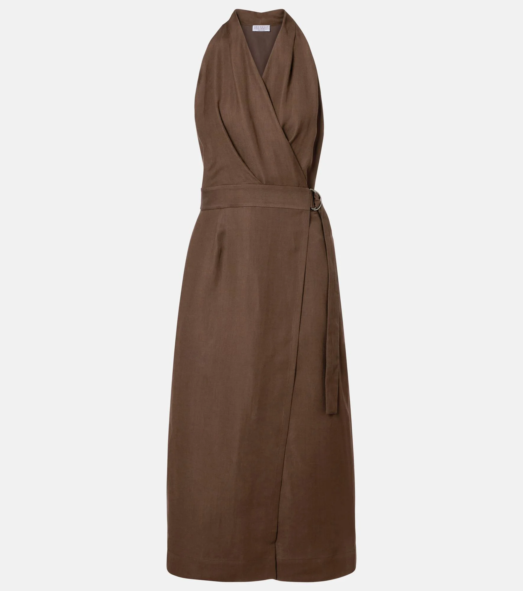 Take on warm weather in style with this wrap dress from Brunello Cucinelli. The design is crafted from twill, has an ankle-length hemline, and secures with an adjustable belt. Product Details - Material: 73% viscose, 27% linen - Care instructions: dry clean - Made in Italy - Designer color name: Chocolate - Item color: brown - Lining: 74% acetate, 26% silk - Insert: 100% brass - Closure: self-ties - Pockets: side slit pockets - Item number: P01054542 Size & Fit - True to size - Cinched waist - Adjustable at the waist - Non-stretchy fabric - The model seen in the picture is 178cm-5'10" and wearing a size XS