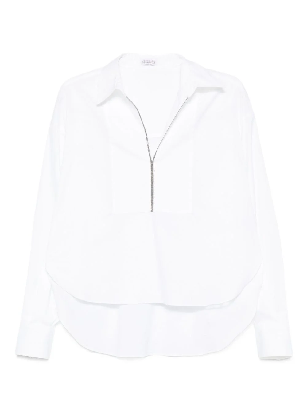 V-neck blouse Highlights - White - Long sleeves - Monili chain detail Made in Italy Composition Cotton 72%, Polyamide 23%, Elastane 5% SIZE & FIT Model measurements Height 5 ft 11 in(1.8 m) Bust/Chest 31.49 in(80 cm) Hips 36.61 in(93 cm) Waist 24.4 in(62 cm) Washing instructions Hand Wash