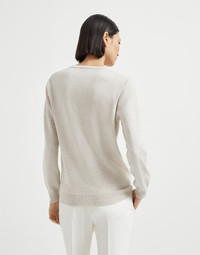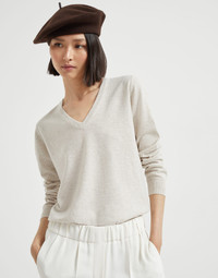 The excellence of knitwear is combined with refined details in true Brunello Cucinelli style to enrich the essential lines of this V-neck sweater. The smooth, soft pure cashmere texture is illuminated behind the neck with a shiny monili embroidery that adds a precious sparkling note. MATERIALS The noble cashmere fiber is characterized by an extreme fineness and also for its precious insulating qualities which guarantee warmth, providing coverage and lightness when worn. DETAILS V-neck Regular sleeve Plain stitch Nickel-free monili decoration 100% CASHMERE