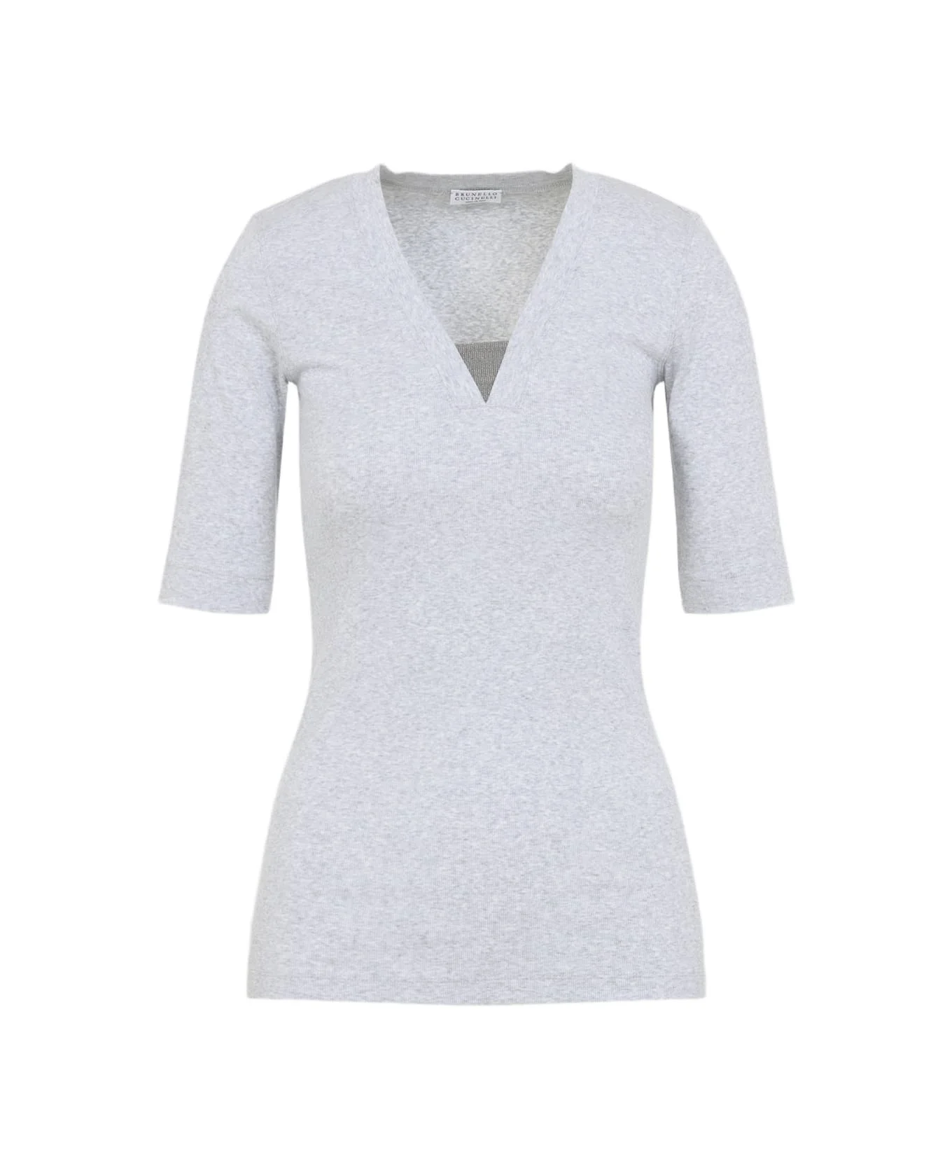 Brunello Cucinelli Silver Grey Cotton V-Neck Ribbed T-Shirt. Crafted in cotton and elastane blend. V-neck, front silver pearls details, short sleeves, straight hem, ribbed all-over, tonal stitching. Made in: Italy Color: Silver Model number: M0TC8EL692C8003