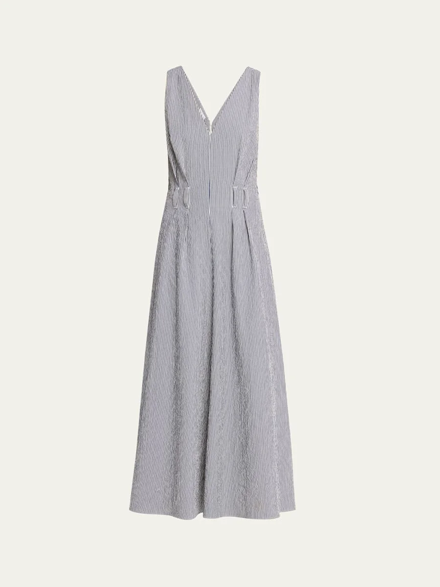 V-Neck Seersucker Cotton Sleeveless Midi Dress