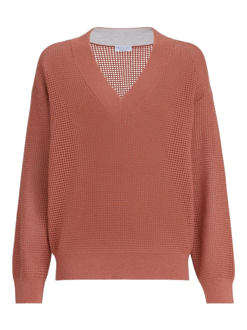 V-neck sweater Highlights - Orange - Net design - V-neck - Long sleeves - Ribbed hem - Ribbed cuffs Made in Italy Composition Cashmere 100% Washing instructions Read Manufacturer Guidelines