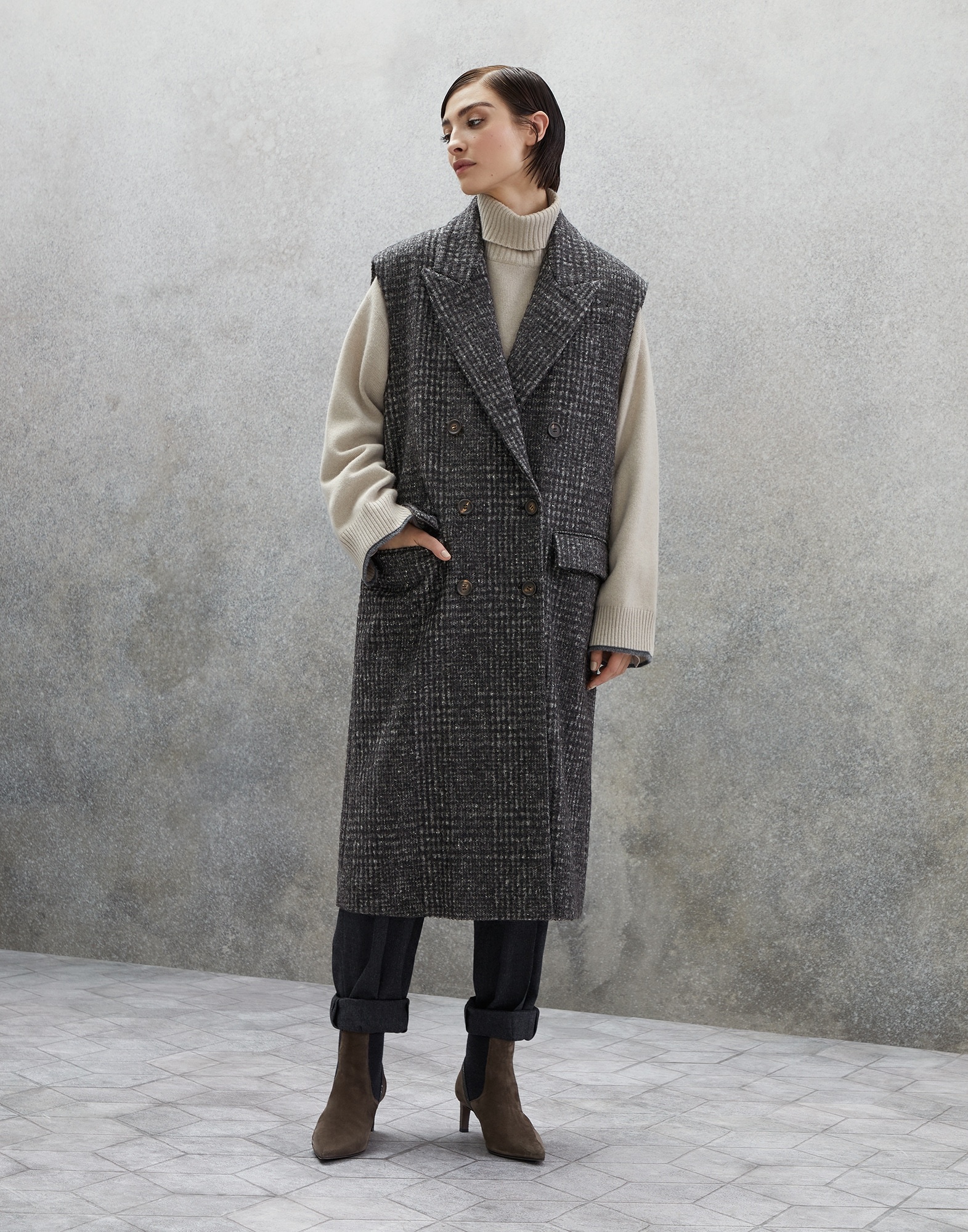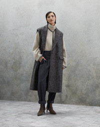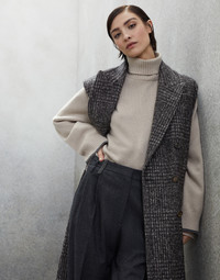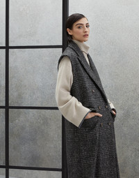 Refined Brunello Cucinelli materials enrich the silhouette of this sleeveless coat in Prince of Wales fabric. The premium virgin wool, alpaca and mohair fabric helps to make the garment elegantly structured and gives it a cozy fit, while the classic pattern highlights its timeless allure. A precious monili embroidery behind the collar complements the piece with an unexpected sparkling touch. MATERIALS The warm, lightweight fabric combines virgin wool, alpaca and mohair threads dyed in different colors of the season to recreate a classic Prince of Wales check design that takes on an almost melange appearance. The combination of fibers helps give body to the fabric, as well as a slightly voluminous appearance. DETAILS Horn button closure Silk-blend crêpe lining Lapel collar Hand pockets with flap Chest pocket Nickel-free monili decoration 50% VIRGIN WOOL, 20% NYLON, 15% ALPACA, 15% MOHAIR