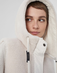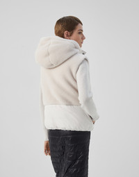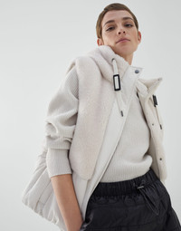 Refined material contrasts and iconic details define the elegant allure of this Panel down vest. The garment alternates the soft, full texture of luxurious virgin wool and cashmere fleecy with the smooth hand of the taffeta detailed at the bottom. Plush, lightweight padding guarantees comfort and warmth, while the hood’s drawstring is illuminated with inserts embroidered in shiny monili for a feminine touch in true Brunello Cucinelli style. MATERIALS Very soft and with a wintry feel, the virgin wool and cashmere Fleecy is a special yarn characterized by small fringe, which after knitting, undergoes a process that allows the cashmere fiber to expand in a way to best express the material’s unique softness and take on a very full appearance. DETAILS Double closure with zip and snaps Water-resistant nylon lining Adjustable drawstring hood Hand pockets with snap Drawstring hem Padding made from high-quality natural materials: 90% goose down, 10% goose feathers Nickel-free monili decoration 55% POLYESTER, 45% COTTON