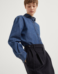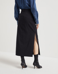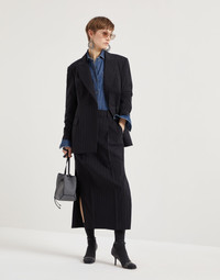 The essential lines of this Sartorial Column skirt are updated with elegant combinations and menswear-inspired fabrics. The striped pattern is paired with a silhouette featuring straight lines where the pleats and the side closure stand out, an elegant reinterpretation of the tabbed waistband from menswear. MATERIALS The soft, lightweight texture of virgin wool and cotton showcases fine pinstripes, a classic pattern of tailored menswear-inspired fabrics. The light lining provides added comfort. DETAILS Zip closure with button and backing button Front pockets Back welt pockets Acetate lining Pleat Vent at bottom 60% VIRGIN WOOL, 40% COTTON