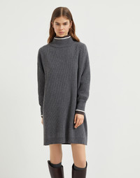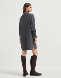 The excellence of Brunello Cucinelli yarns elevates the distinctly casual attitude of this new virgin wool, cashmere and silk knit dress. The garment features a relaxed, slightly oversized fit, emphasized by its dropped shoulders and generous sleeves, creating an informal, versatile look. The collar and cuffs are highlighted by an elegant color contrast, which adds a sporty note, while the monili detail, the iconic embellishment of the Brunello Cucinelli collections, completes the dress with a refined sparkle. MATERIALS The refined virgin wool, cashmere and silk yarn offers lightness and comfort when worn, without sacrificing the right amount of protection that is essential between seasons. DETAILS Teardrop opening with button at back of neck Funnel neck Drop shoulder Balloon sleeve English rib 60% VIRGIN WOOL, 30% CASHMERE, 10% SILK