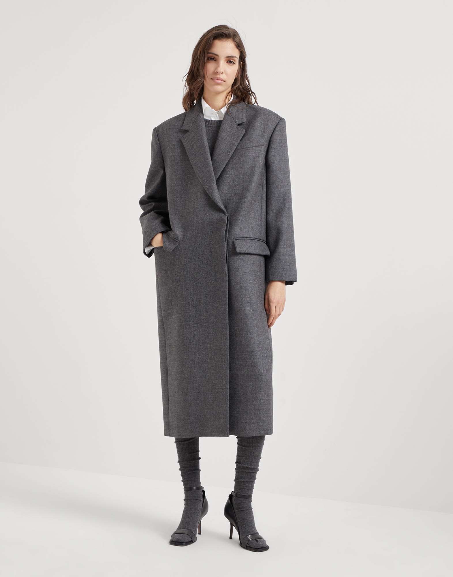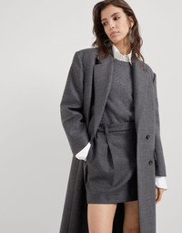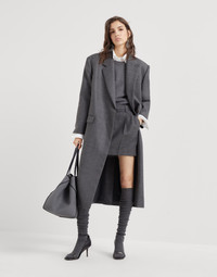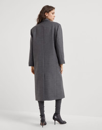 This virgin wool overcoat reinterprets retro proportions in a feminine way, thanks to refined fabrics and sparkling embellishments. The fabric’s compact texture is paired with a slightly oversized silhouette, which particularly emphasizes the shoulders to recreate menswear-inspired proportions. A fine shiny monili embroidery behind the neck completes the look with an elegant note. MATERIALS A material of timeless elegance, the virgin wool fabric features a very fluid hand and a smooth, compact texture. A silk-blend crêpe lining completes the garment and provides added comfort. DETAILS Button closure Silk-blend crêpe lining Hand pockets with flap Chest pocket Single back vent Nickel-free monili decoration 100% VIRGIN WOOL