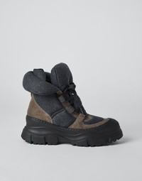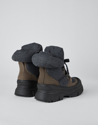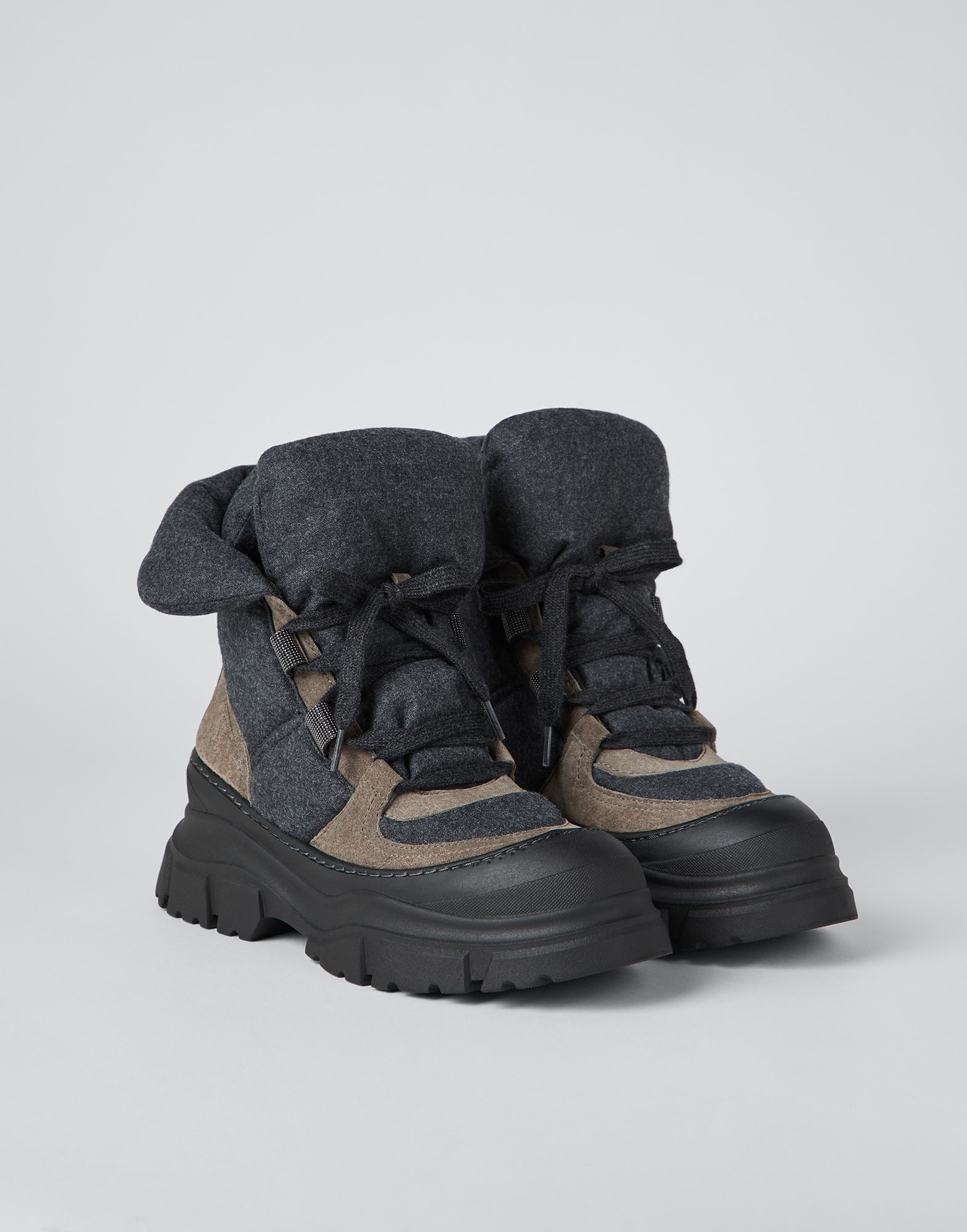 An “Alpine” feel meets Brunello Cucinelli’s refined materials and details in these new boots. The soft padding enhances the virgin wool flannel’s cozy texture and is paired with velvety suede inserts and a bold rubber bottom to define the footwear’s wintry look. Embroidered in fine rows of shiny monili, the lace loops complete the boots with an iconic feminine note. MATERIALS The soft, slightly full appearance of pure virgin wool flannel is paired with the velvety hand of refined suede, defining the upper with an elegant texture contrast with a wintry feel. A leather lining and a rubber outsole provide added comfort. DETAILS Flat cashmere laces Fabric lining TPU rubber tread Nickel-free monili decoration 100% VIRGIN WOOL