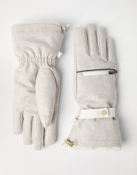 A Mountain look and refined Brunello Cucinelli materials come together in these new gloves. The lightweight Thermore® padding adds a touch of volume to the accessory and provides added warmth for days outdoors. The cozy texture of virgin wool flannel and soft shearling inserts create an alluring texture contrast. The shiny monili detail completes the gloves with an iconic feminine note. MATERIALS Crafting of the pure virgin wool flannel enhances the noble qualities of the natural fiber, giving it the classic soft, semi-full appearance. A thin membrane ensures the right protection from the elements, without compromising lightness. DETAILS Elastic at wrist Snap at wrist Zipper pocket Velcro cuffs Shearling lining Thermore® padding Nickel-free monili decoration 100% VIRGIN WOOL