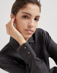 Casual details and refined materials come together in this new virgin wool organza shirt. The ultra-lightweight fabric is combined with the functional style of the chest pockets. The monili detail on the edge of the cuffs completes the shirt with an elegant, sparkling touch. MATERIALS The new organza is a fabric with a light, impalpable effect. The mix of virgin wool with a synthetic fiber creates a dry, semi-crisp texture with slightly mottled hues. DETAILS Placket closure with snaps Classic collar Two patch chest pockets with flap and button Cuffs have two snaps Nickel-free monili decoration 100% VIRGIN WOOL
